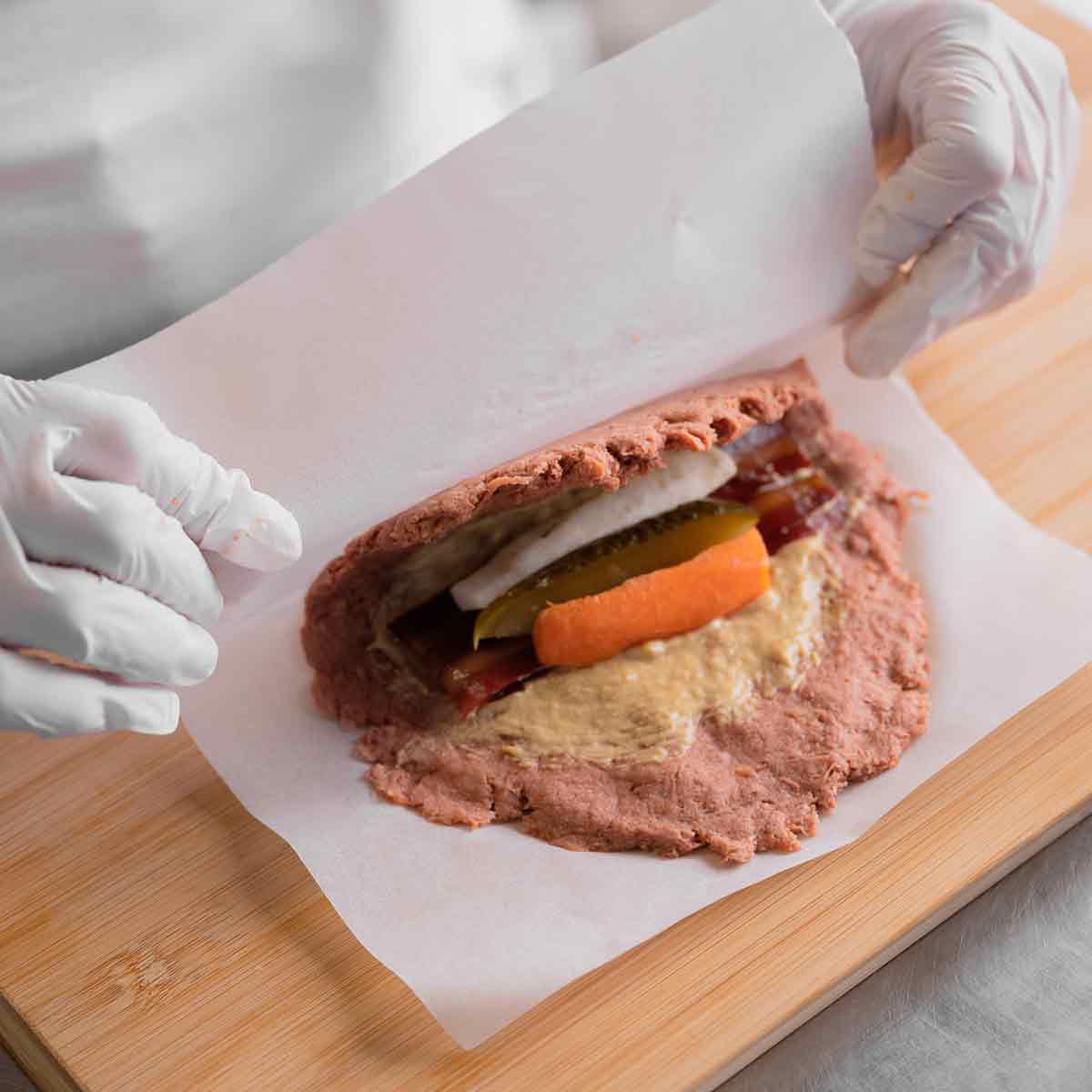 Vegane Roulade auf Pflanzenprotein-Basis: Pflanzenproteine 34,9% (Texturiertes SOJAPROTEIN, Erbsenprotein), Trinkwasser, WEIZENPROTEIN, Karotten 7,5%, Wurzelpetersilie 7,5%, Essiggurken 7,5% (Gurke, Wasser, Essig, Zucker, Salz, Zwiebel, Gewürz, SENFKÖRNER, Aroma), Rapsöl, Veganer Speck 4,5% (Extrudiertes SOJAPROTEIN (SOJAPROTEIN, Tinkwasser), Trinkwasser, Rote Rübensaft, WEIZENPROTEIN Salz, Kokosöl, Aroma), SENF (Trinkwasser, SENFKÖRNER, Essig: 7,5 % Säure, Isoglucosesirup, Speisesalz, Gewürze), Aromen, Rote Rüben Saft, Verdickungsmittel: Methylcellulose, Meersalz unjodiert, Bambusfasern, Konservierungsstoff: Kaliumsorbat, Säuerungsmittel: Milchsäure*, Zwiebelpulver *vegan // naturbedingt Gewichtsschwankungen möglich