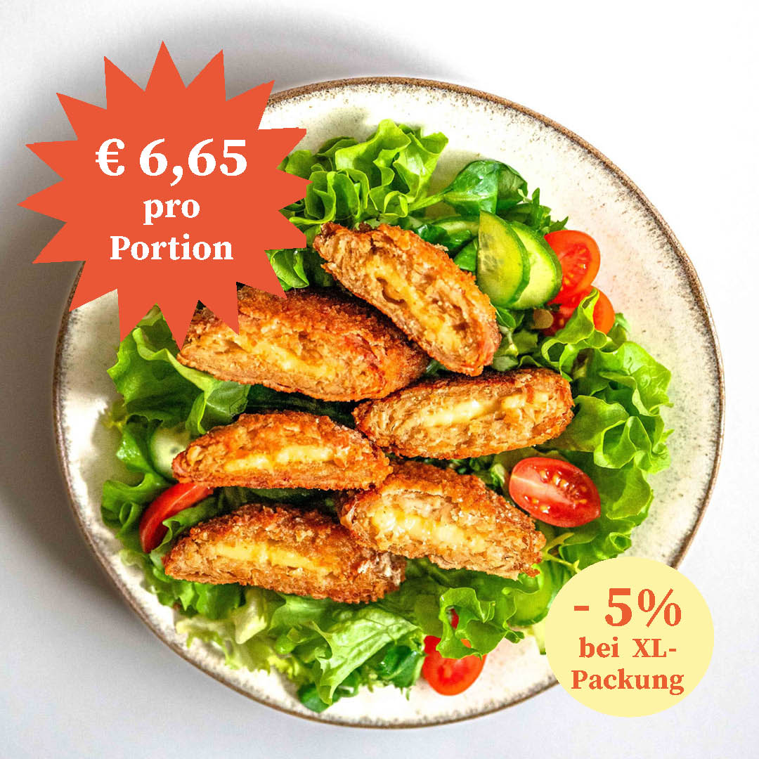 Veganes Schnitzel auf Pflanzenprotein-Basis: 16 % Pflanzenfett-Stärkezubereitung (Trinkwasser, Kokosnussöl, modifizierte Stärken, Speisesalz, Kräuter, Olivenextrakt, Farbstoff: B-Carotin), 11,1 % Pflanzenproteine (Texturiertes SOJAPROTEIN, Erbsenprotein), Trinkwasser, Panade: (WEIZENMEHL, Salz, Modifizierte Stärke, Hefe, Gewürze, Verdickungsmittel: Guarkernmehl), Rapsöl, WEIZENPROTEIN, Raps- u. Sonnenblumenöl, Natürliche Aromen; Verdickungsmittel: Methylcellulose, Meersalz unjodiert, Bambusfasern, Konservierungsstoff: Kaliumsorbat; Säuerungsmittel: Milchsäure*, Zwiebelpulver; *vegan